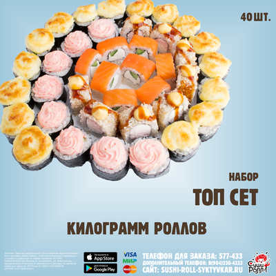 К данному набору бесплатно прилагается: соевый соус (140 мл), маринованный имбирь (40 гр), васаби (15 гр).