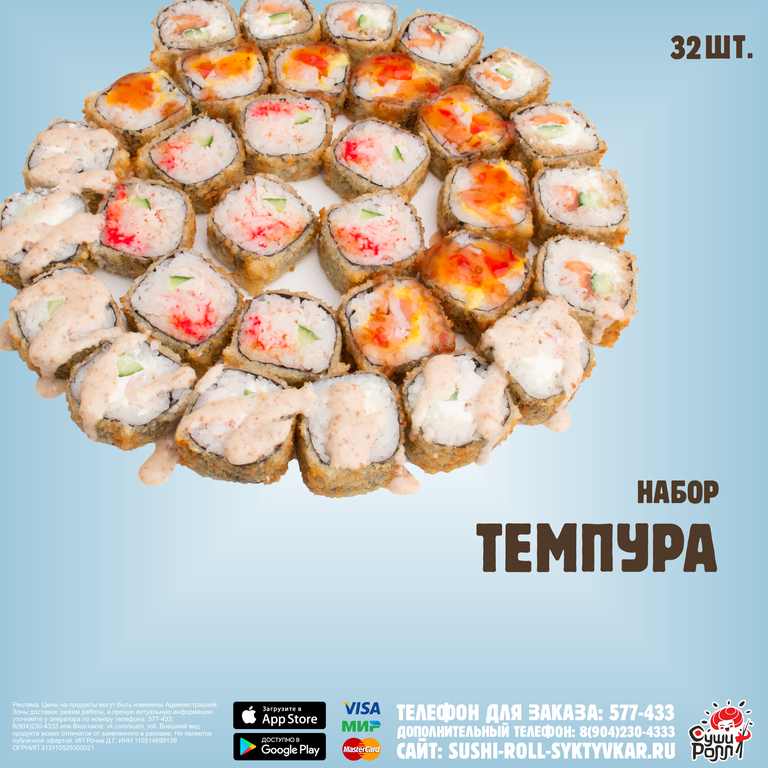 К данному набору бесплатно прилагается: соевый соус (140 мл), маринованный имбирь (40 гр), васаби (15 гр).
