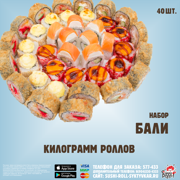 К данному набору бесплатно прилагается: соевый соус (140 мл), маринованный имбирь (40 гр), васаби (15 гр).
