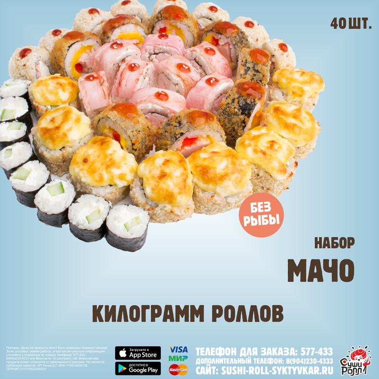 К данному набору бесплатно прилагается: соевый соус (140 мл), маринованный имбирь (40 гр), васаби (15 гр).