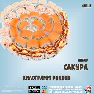 К данному набору бесплатно прилагается: соевый соус (140 мл), маринованный имбирь (40 гр), васаби (15 гр).