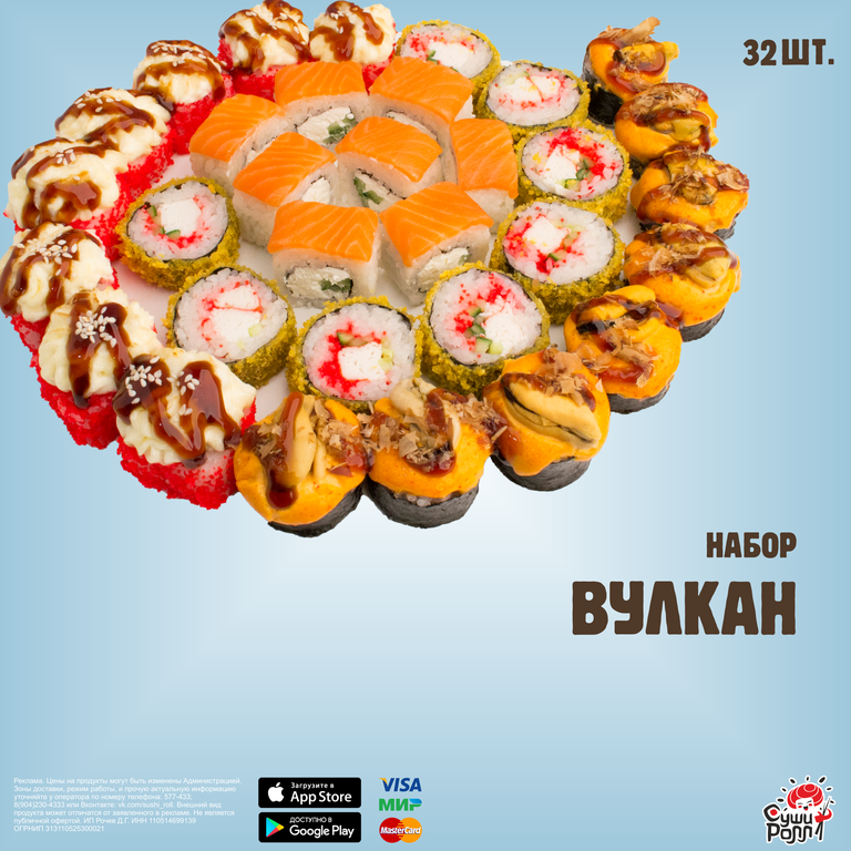 4-й ролл: рис, нори, натуральный сливочный сыр, мидии, хрустящий лук фри, копченая стружка тунца Бонито, запеченная шапочка на основе острого соуса Спайси, соус Унаги. 8 шт.