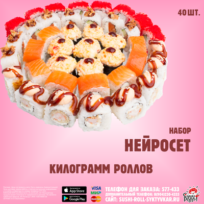 К данному набору бесплатно прилагается: соевый соус (140 мл), маринованный имбирь (40 гр), васаби (15 гр).